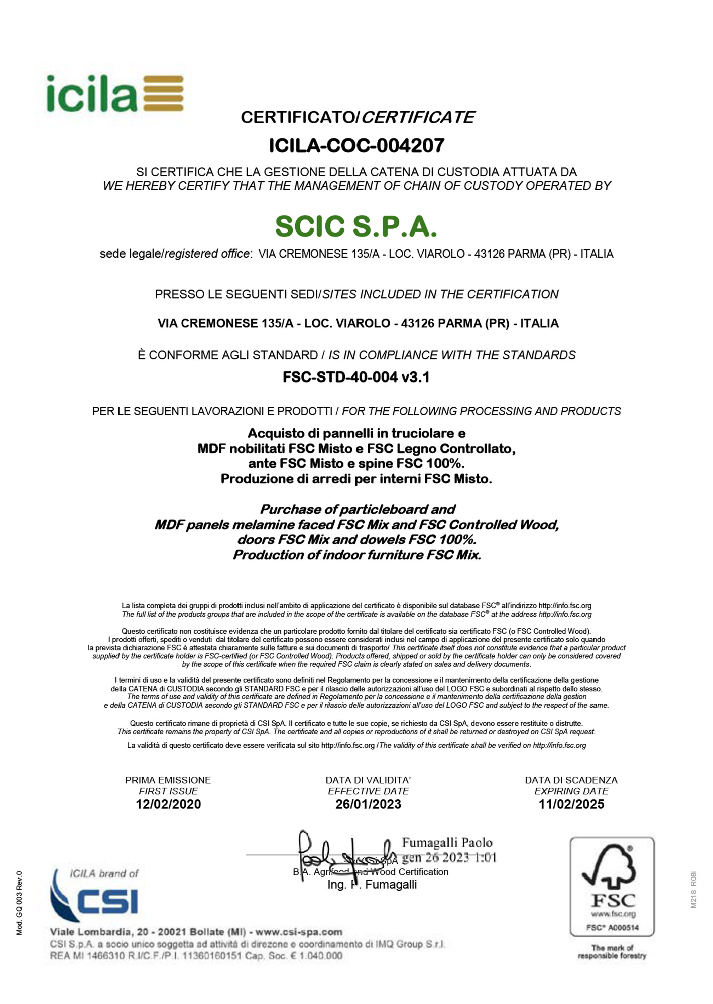 Thanks to this award, SCIC Italia can buy, transform and sell FSC® certificated materials. A commitment that guarantees the safe and conscious traceability of wood components.