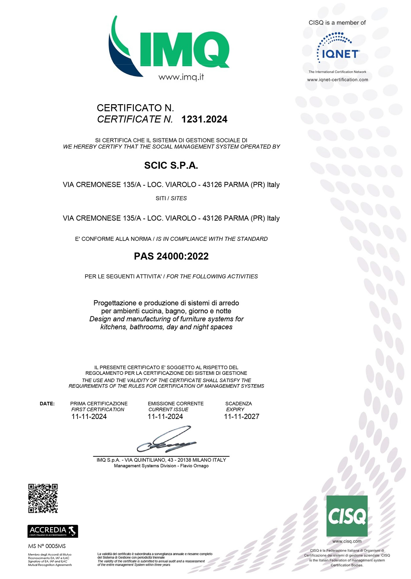 The certification is a concrete step forward in SCIC’s comprehensive process of improving its business policies: through PAS 24000:2022 it is possible to implement more conscious practices and respond to the needs of a client increasingly attentive to the theme of transparency, business ethics and social responsibility.