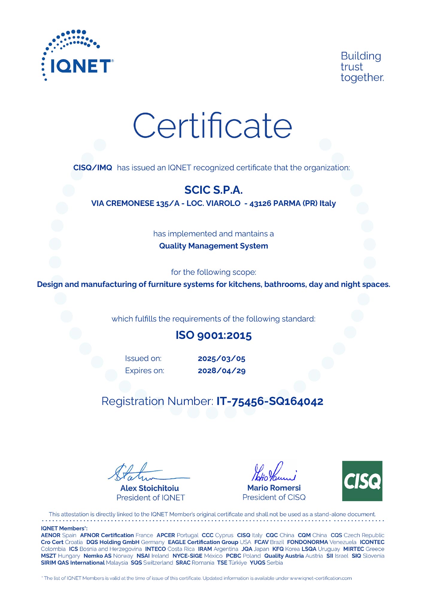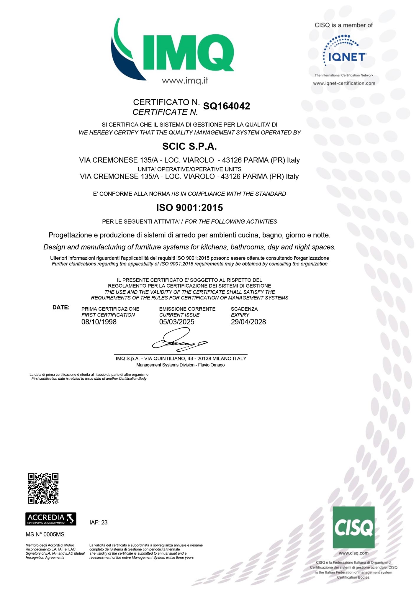 Thanks to our “Total Quality” policy, in 1998 we were among the first companies to be certified for compliance with the international standards. The Quality System implemented in all the organizational, manufacturing and service phases has been recognized as compliant with the UNI EN ISO 9001:2015 and has obtained the Italian and international Quality Management System certification.