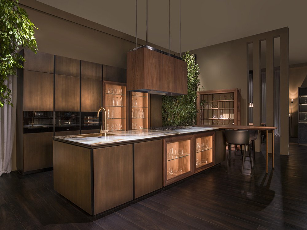 Scic reinterprets the Labirinto model, with a new combination of shapes and materials presented at the Salone del Mobile 2018. The refined style is unveiled by the combination of materials: antique brass, patagonian marble and walnut wood. The black aluminum frame door and the backlit patagonian plan gives lightness and elegance to the all kitchen.