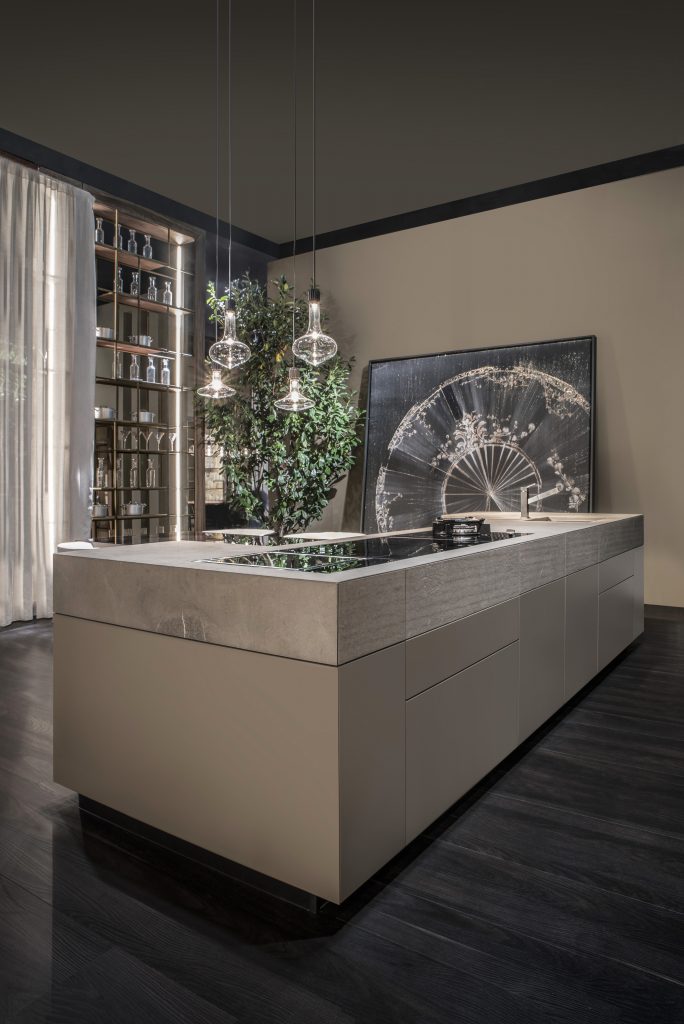 From this idea comes a kitchen that combines technology and essence. The flamed Fossena stone of the top integrates perfectly with the matt taupe lacquered bases celebrating the color-nature combination. The work area is concealed by the top shell with the enclosing block ensuring continuity with the surrounding environment.