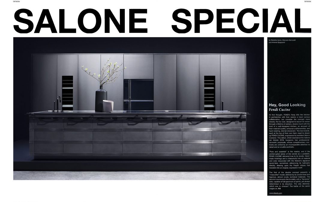 โAt first thought, FENDIโs foray into the kitchen in partnership with Scic seems a most curious collaboration, but consider the concept more closely; the fur coat, designed to escort its owner throught a lifetime of winters, shares much with the brief of a well-designed kitchen, on account of their material quality, asrtisanal craftsmanship, and hard-wearing, eternal classicism. The two brands, eache at the top of their own field, meet to dream up FENDI CUCINE, engineered by architect Marco Costanzi. This debut, which dawned at the Salone del Mobile 2018, burgeons two professional-domestic proposals, whose complimentary contrasts are united by an incomparable attention to detail and an erudite aesthetic.โ