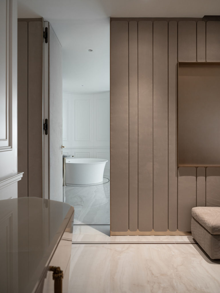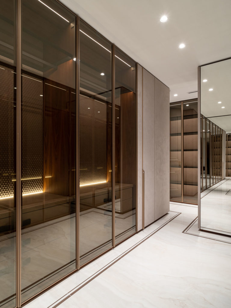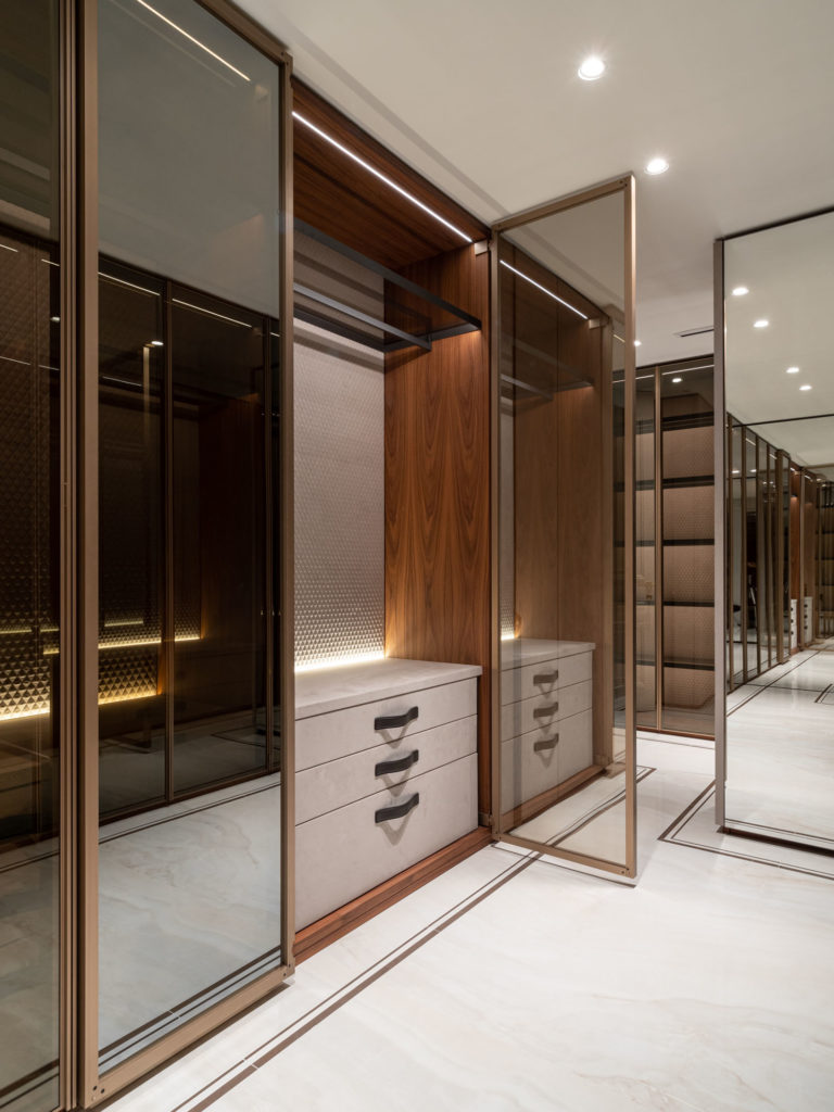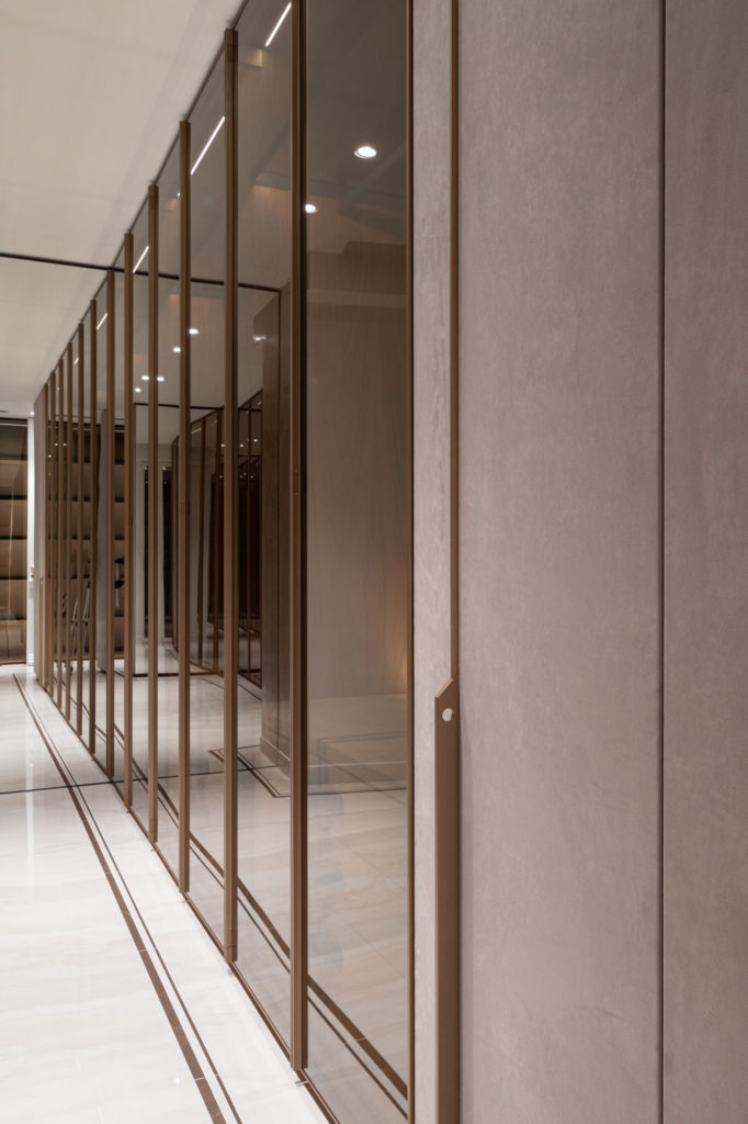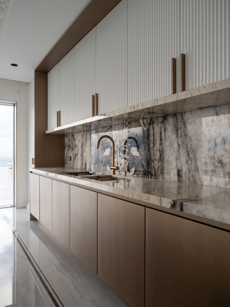 Il top, una lastra di marmo continua, sbalza da un lato continuando fino al tavolo. La spigolosità del materiale è addolcita dai toni chiari e dalla luce che si diffonde dalla retro-illuminazione del piano. L’eleganza e la ricchezza della composizione risaltano dall’accostamento di due materiali nobili, il marmo e l’ottone e dalla presenza di dettagli che, riprendendo la geometria del modello, enfatizzano la linearità e l’armonia di un continuum che insegue tutta la composizione.